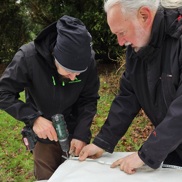 Und die Truppe hat nicht nur gearbeitet, sie hat regelgerecht geschuftet. Knapp 6 Stunden lang! 4 Tonnen grober Split sind auf dem Parkplatz und dem Feldweg verteilt, alle neuen Scheibenständer sind jetzt auch mittels Bodenhülsen befestigt und nivelliert, das Netz hängt wieder richtig, die Pfeilfangwand am Einschießplatz ist repariert und es gibt jetzt eine neue / zweite 25 Meter Schusslinie.