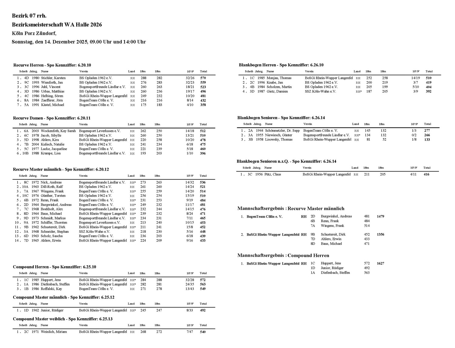 Sonntag, 14. Dezember. Eigentlich ist der 3. Advent. Doch für die BogensportlerInnen des Bezirks 7 Köln rechtsrheinisch steht die BM Halle im Sportjahr 2026 auf dem Programm.