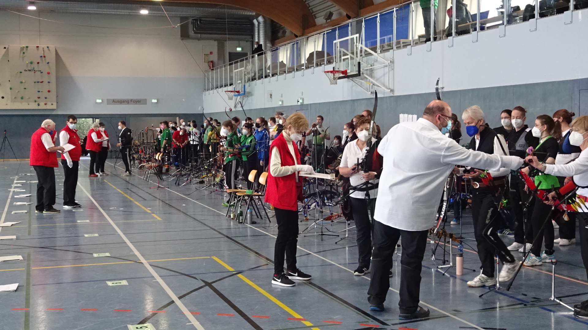 Der Rheydter Turnverein war diesmal der Ausrichter der Landesverbandsmeisterschaft des RSB in der Krahnendonkhalle in Mönchengladbach. 22 Scheiben waren aufgebaut und an 2 Wettkampftagen haben insgesamt 283 Schützen in verschiedenen Bogen- und Altersklassen teilgenommen. Zur allgemeinen Sicherheit waren 2G und zusätzlich ein aktueller Coronatest für alle Teilnehmer vorgeschrieben.